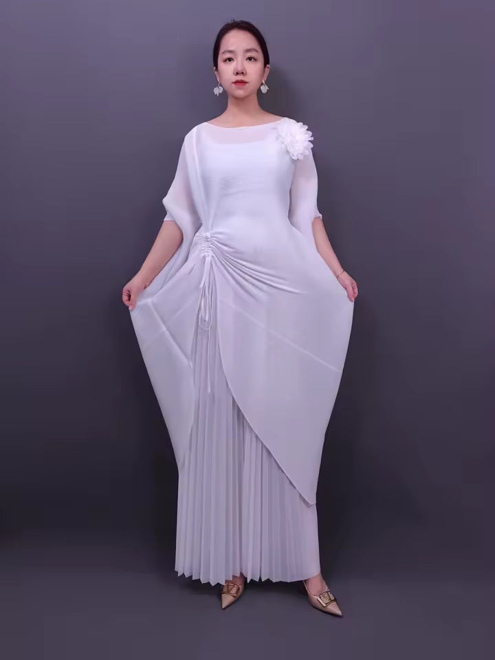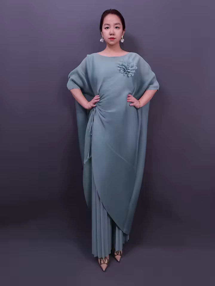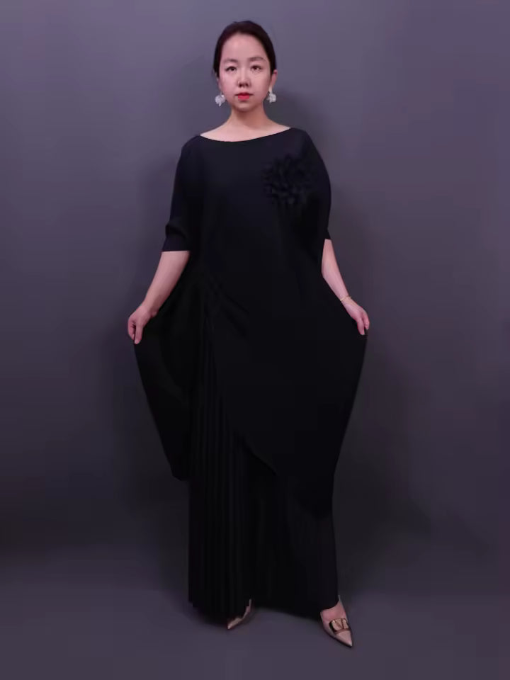 The MIYAKI STRING SET combines contemporary silhouette with inclusive sizing. This two-piece ensemble features a batwing sleeve top that drapes elegantly across the shoulders, paired with high-waisted wide-leg pants for a balanced, flattering fit. One-size-fits-most design accommodates plus-size frames with ease. Perfect for those seeking versatile separates that transition seamlessly from casual to semi-formal occasions.